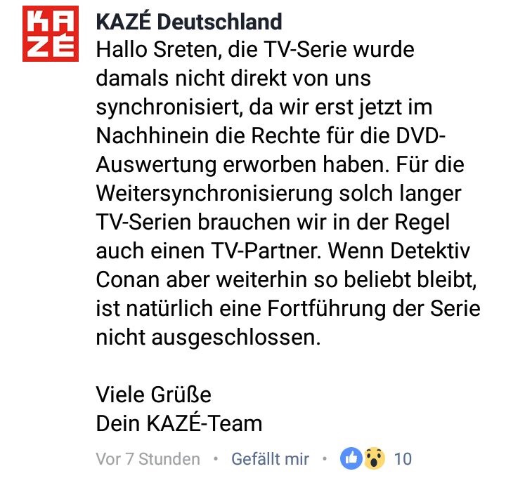 Das hört sich doch recht interessant an. Hoffen wir, dass "Detektiv Conan" weiterhin so beliebt bleibt, dann sieht es nicht schlecht aus, dass "Detektiv Conan" weiter synchronisiert wird. KAZÉ braucht sich doch nur an ProSieben Maxx wenden, das ist ein TV-Sender bzw. TV-Partner. Schauen wir einfach mal wie es Ende 2017/Anfang 2018 oder im Februar oder im März 2018 aussehen wird, wenn die 333 Folgen durchgelaufen sind.