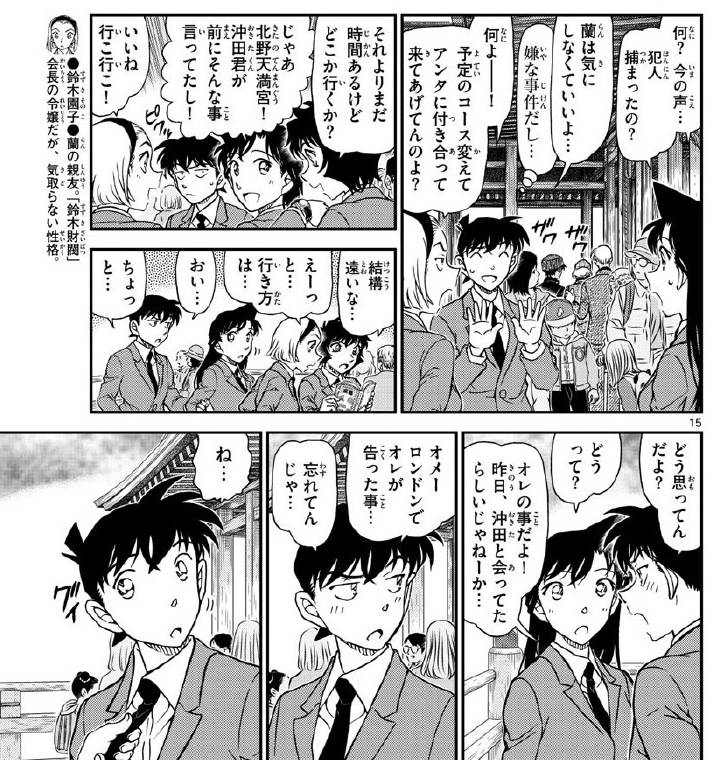 Die Frage war aber, ob der Kyoto-Arc mit 1005 oder 1006 endet. 1004 stand eigentlich immer als Ende außer Frage anhand der Aussagen, die Gosho in den letzten Wochen getroffen hat. Ende August hatte er gesagt, dass der Arbeitsprozess an den Kyoto-Kapiteln hart sei und da Weekly-Mangaka generell die Kapitel immer drei Wochen vor Veröffentlichung anfertigen, stand ziemlich fest, dass 1005 frühestens das Ende sein kann.