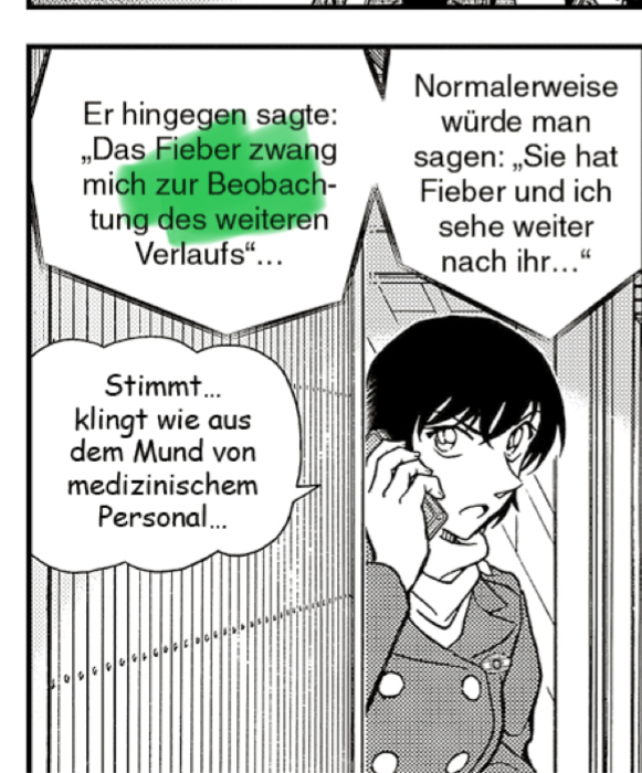 Kapitel 1125, Seite 8: Ein Text wurde in zwei verschiedene Sprechblasen eingefügt. Der Text »Er hingegen sagte: „Das Fieber zwang mich zur Beobachtung des weiteren Verlaufs“…« gehört eigentlich nur in die untere Sprechblase (im Screenshot grün markiert). In die obere Sprechblase (im Screenshot rot markiert) gehört laut japanischer Veröffentlichung sowas wie »Stimmt das, Conan?« oder »Bist du sicher, Conan?«