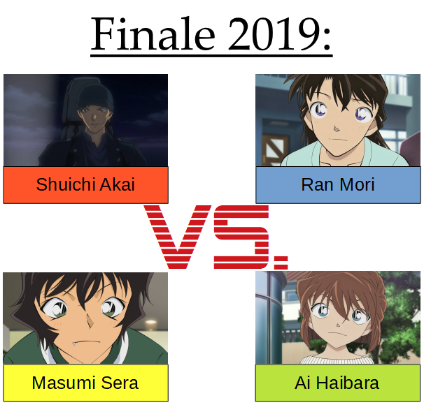 Da ist es: Das Finale des CharakterContests 2019! Hier müsst ihr euch zwischen den vier verbliebenen Charakteren entscheiden und festlegen, wer den CharakterContest 2019 gewinnen wird. Wichtig hierbei: Die Abstimmung geht ganze zwei Tage, also extra viel Zeit für euch, eure Favoriten anzufeuern! Ist es der FBI-Agent Shuichi Akai, die Oberschülerdetektivin Masumi Sera oder doch eine der (ehemaligen) Liebesrivalinnen, Ran Mori oder Ai Haibara? Zum letzten Mal gilt: Ihr habt es in der Hand bzw. auf der Maus!